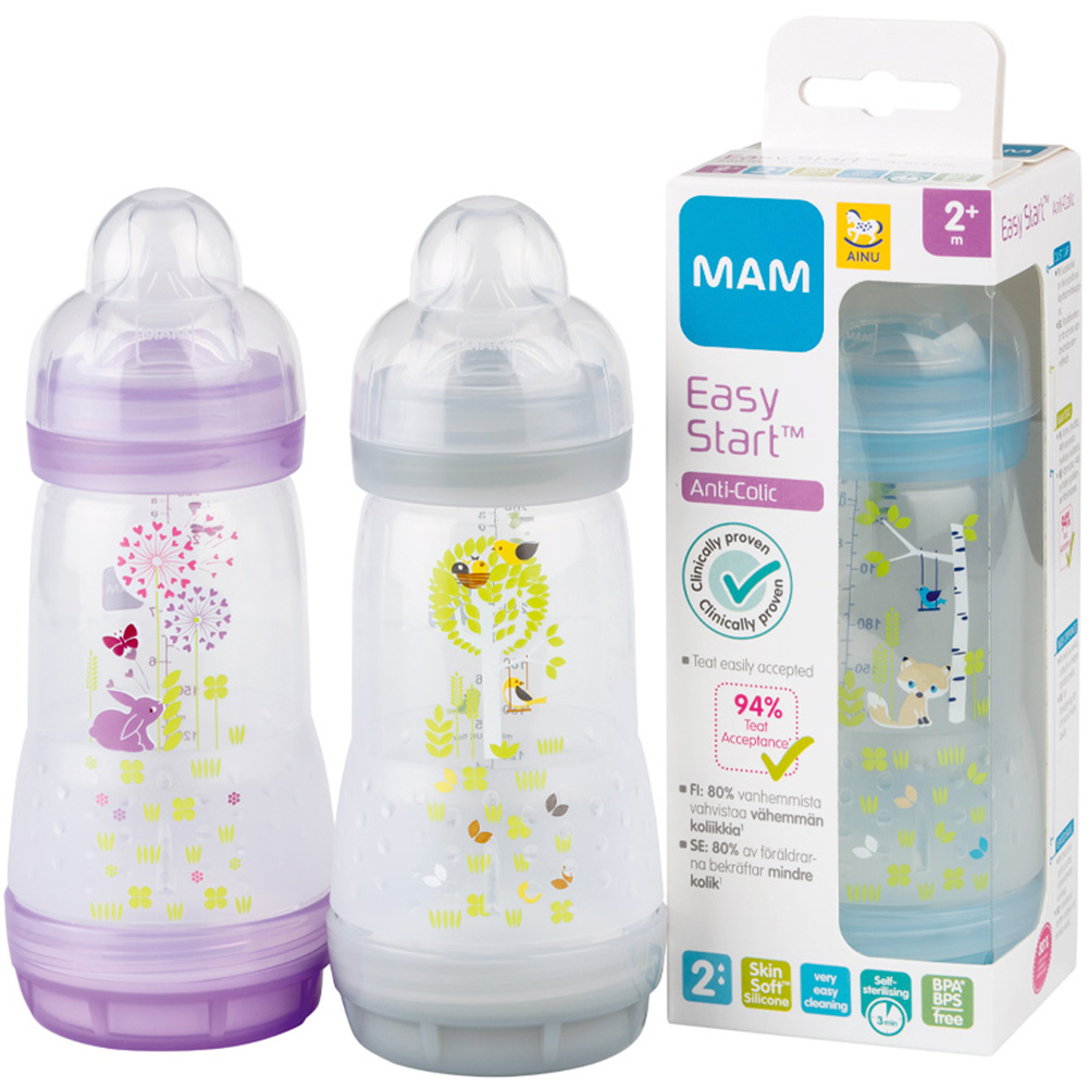 Ainu MAM Easy Start 260 ml tuttipullossa on ilmastoitu pohja, jonka ansiosta vauva voi nauttia maitonsa rauhallisesti. Tuttipullosta ei kulkeudu ilmaa vauvan vatsaan ja se vähentää pienille vauvoille tyypillistä koliikki oireilua. Pullossa on leveä suuaukko, joka helpottaa pullon puhdistamista ja täyttämistä. Easy Start tuttipullo on helppo steriloida mikrossa, samalla steriloituu myös pullotutti. Pakkauksessa mukana 2+kk pullotutti, pullotutteja eri virtausnopeuksilla on ostettavissa erikseen. Kestää myös keittämisen 5 minuuttia, pesun astianpesukoneen yläkorissa sekä mikroaaltouunin. BPA ja BPS vapaa.