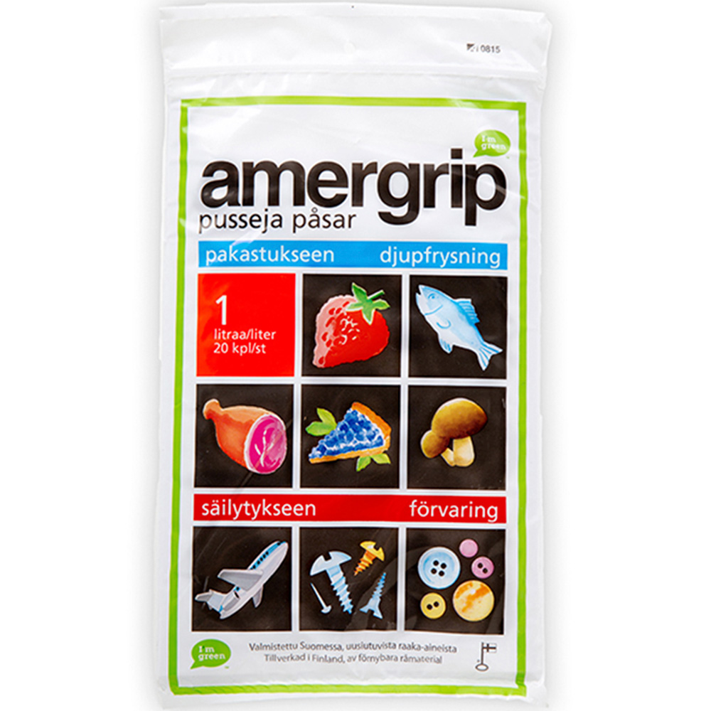 Amergrip®-pusseissa voit säilöä, säilyttää ja kuljettaa. Pussi soveltuu elintarvikkeiden pakkaamiseen. Pussi on kirkas ja läpinäkyvä. Valkoinen kirjoitusalusta on painettu pussiin valmiiksi. Kestää sulatuksen mikroaaltouunissa sulatusteholla tai vesihauteessa (ei liedellä).