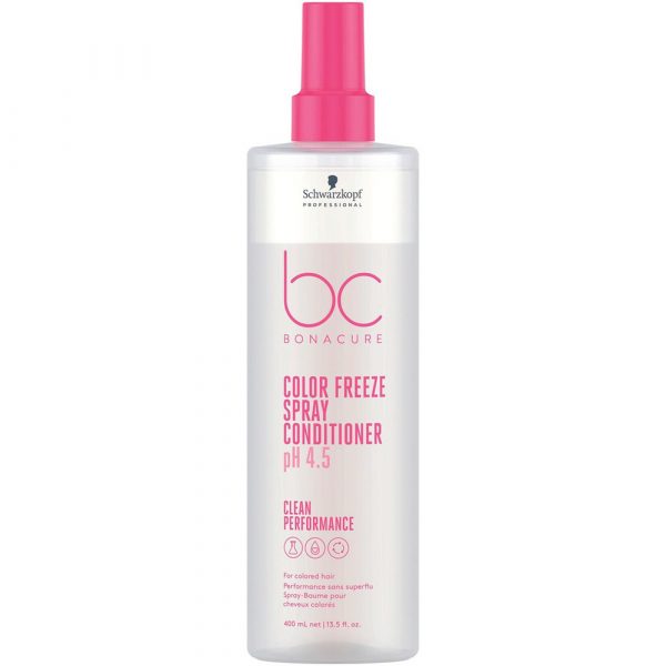 Bonacure Color Freeze -sarjan kevyyt, hiuksiinjätettävä suihkutettava hoitoaine värikäsitellyille hiuksille, joka suojaa hiuksia lämmöltä. Ei sisällä silikoneja tai keinotekoisia väriaineita. Parantaa hiusten kammattavuutta. Hiusvärin lukitseva tuote, joka estää haalistumisen ja takaa pitkäkestoisen värin eloisuuden. Palauttaa hiusrakenteen pH:n ihannearvoon 4,5 ja takaa lähes haalistumattoman hiusvärin.