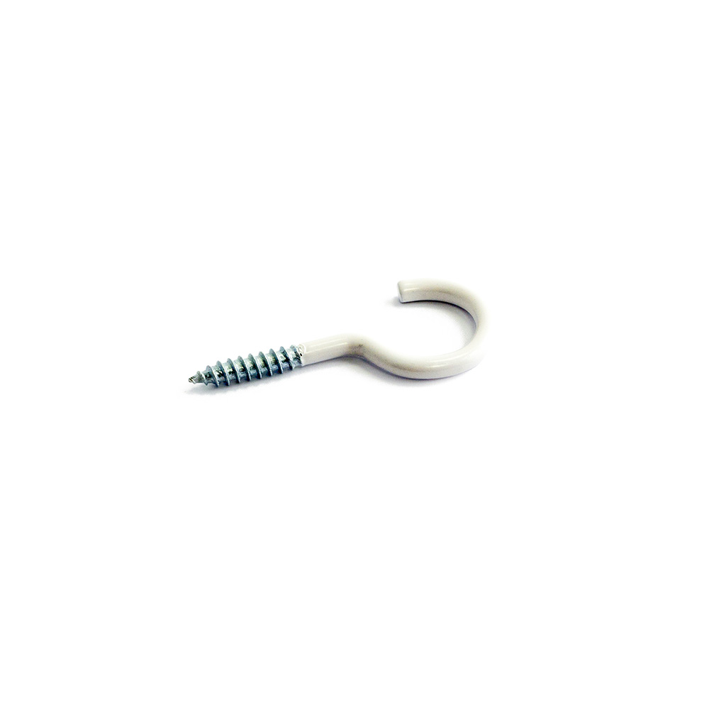 Koukkuruuvi valkoiseksi maalattua terästä. Puukierre 3,5 x 25 mm. Pakkauksessa 5 kpl