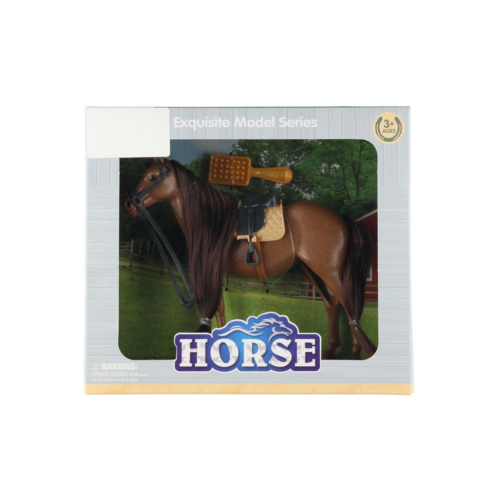Setissä hevonen ja satula. Hevosella kaunis harja, jota voi harjata mukana tulevalla pienellä harjalla. Ikäsuositus 3+.