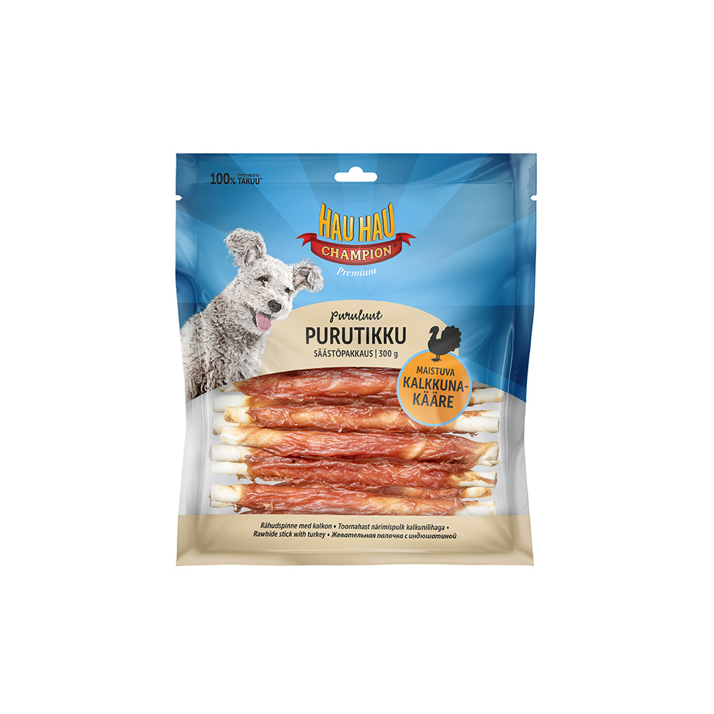 Hau-Hau Champion Kalkkunapurutikku on maistuva naudannahasta valmistettu puruluu, joka on päällystetty mehevällä kalkkunanlihalla. Purutikun syöminen on koiralle mieluisaa tekemistä ja pureskelun aiheuttama hankaus voi edistää hampaiden hyvinvointia.
