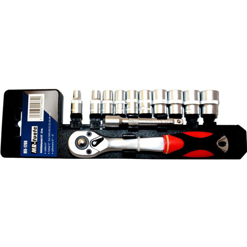 Hylsyt: 5, 6, 7, 8, 9, 10, 11, 12, 13 ja 14 mm. Jatkovarsi 1/4 – 3. Räikkä 1/4