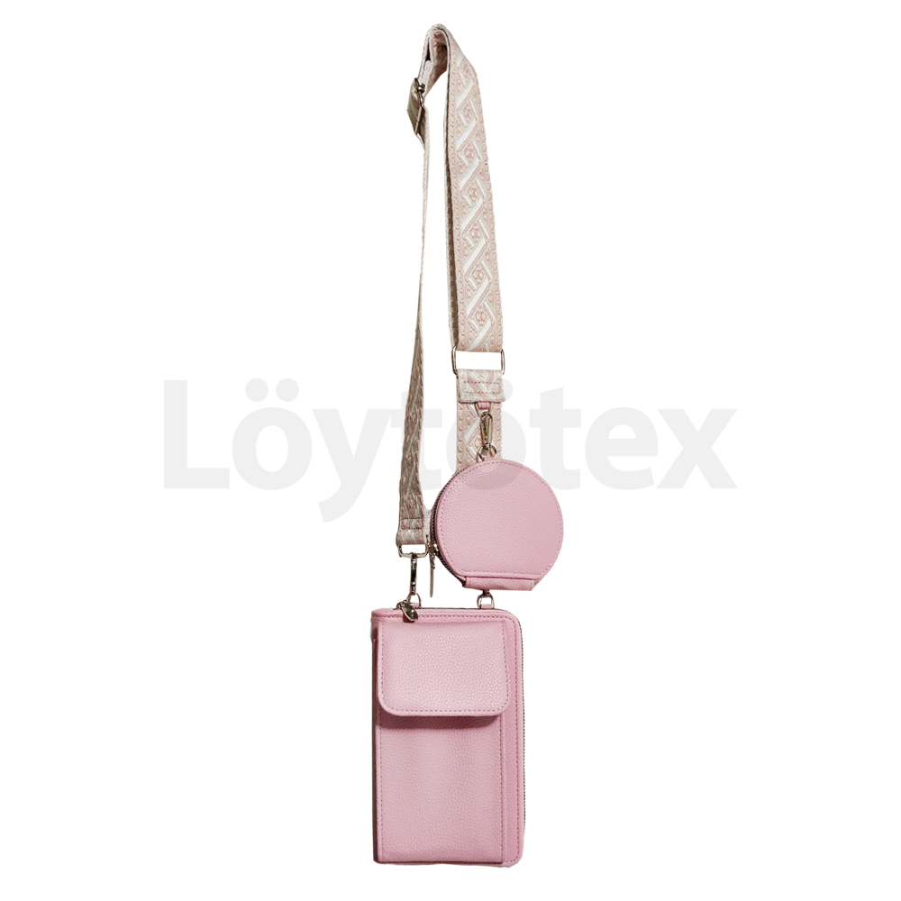 Kännykkälaukku, jossa vetoketjullinen lompakko sekä olkahihnaan kiinnitettävä kolikkopussi, jossa säilöt kätevästi esimerkiksi langattomat nappikuulokkeet. Olkahihnassa säätö mahdollisuus. Lompakossa paikat korteille ja vetoketjullinen tasku. Laukun etuosassa painonapillinen tasku puhelimelle.