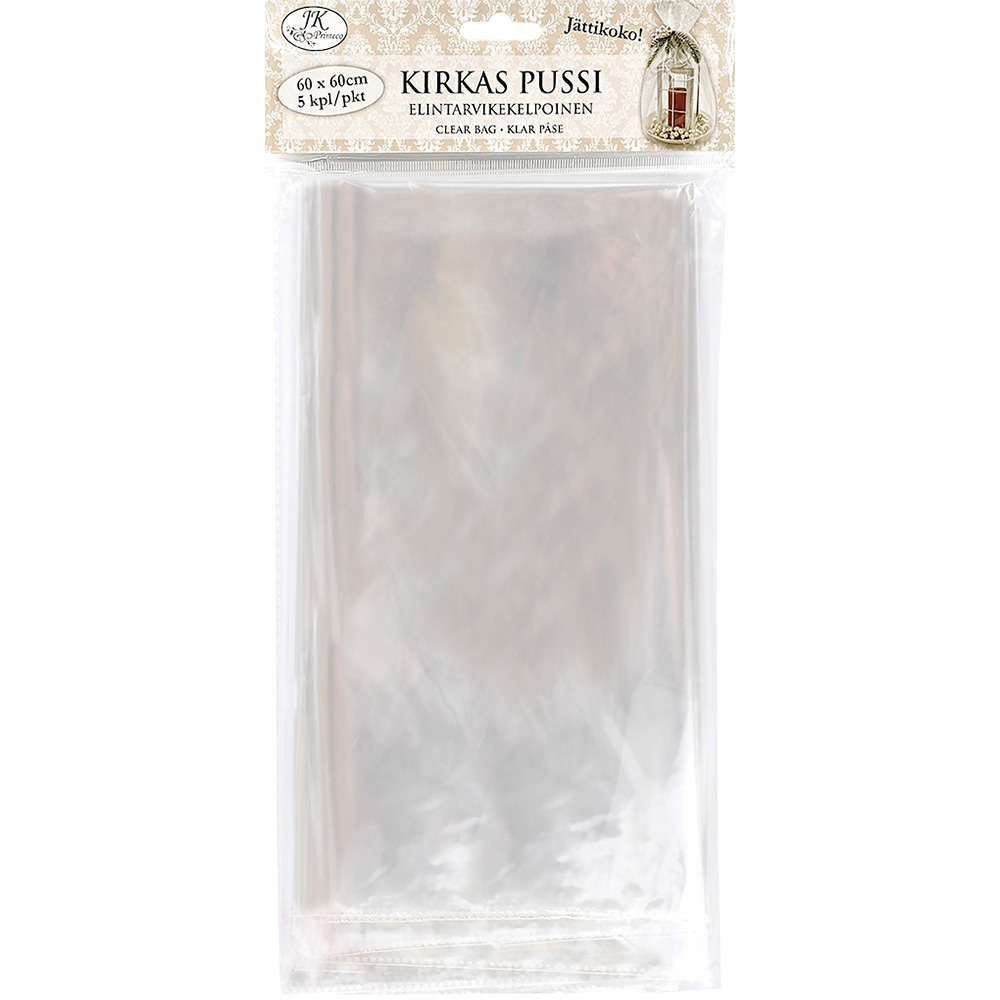 Kirkas pussi paketointiin. Pakkaus sisältää viisi kappaletta muovisia pusseja, jotka ovat elintarvikekelpoisia.