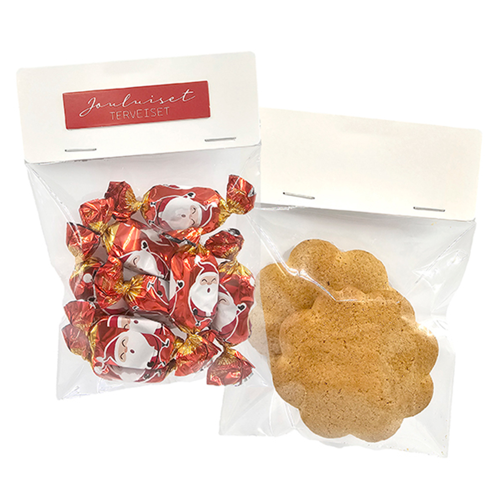Kirkas pussi kartonkietiketillä paketointiin. Pakkaus sisältää viisi kappaletta muovisia pusseja ja viisi kappaletta kartonkisia etikettejä. Pussit ovat elintarvikekelpoisia. Kartonkietiketin voi kiinnittää pussiin esimerkiksi kaksipuoleisella teipillä tai nitojalla. Yhden pussin koko on n. 16cm x 10cm. Kartonkietiketin koko 8cm x 10cm. Pakkauskoko on n. 20 x 13,5cm.