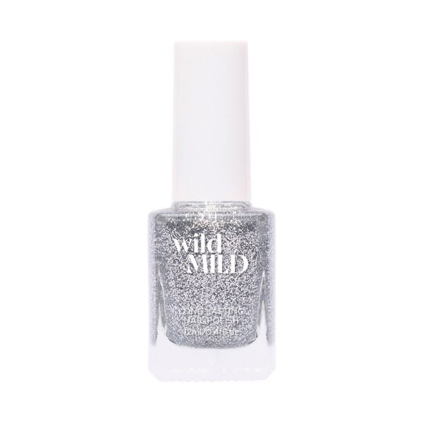 Wild&Mild pitkäkestoinen kynsilakka sävyssä: Prom Queen 294. Kynsilakassa on kirkkaan läpikuultava pohjaväri, jota koristaa hienojakoinen kimalteleva hopea glitter.