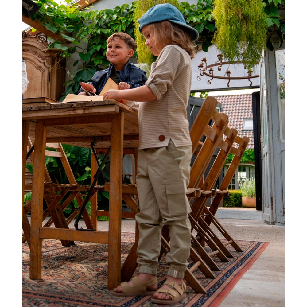 Koko Noko lasten vaaleanvihreät cargohousut. Housujen sivuilla taskut. Housuissa hieman löysä istuvuus ja resorit lahkeissa. Housut valmistettu tukevasta ja hengittävästä, 100% puuvillasta.