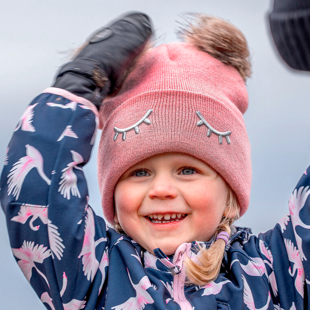 HC Outwear Isabella neulepipo roosa, tupsuilla. Glitterlangalla kudottu neulos kimaltelee lempeästi valossa ja kahden tupsun muoto tuo pipoon leikkisyyttä, jota ei voi katsoa hymyilemättä. Edessä olevat suljetut silmät antavat tälle roosanväriselle pipolle suloisen ilmeen ja tekevät siitä lapsen näköisen pehmeän, vilpittömän ja täynnä mielikuvitusta. Pipo sopii 3-7 -vuotiaille lapsille. Materiaali: 100% akryyli