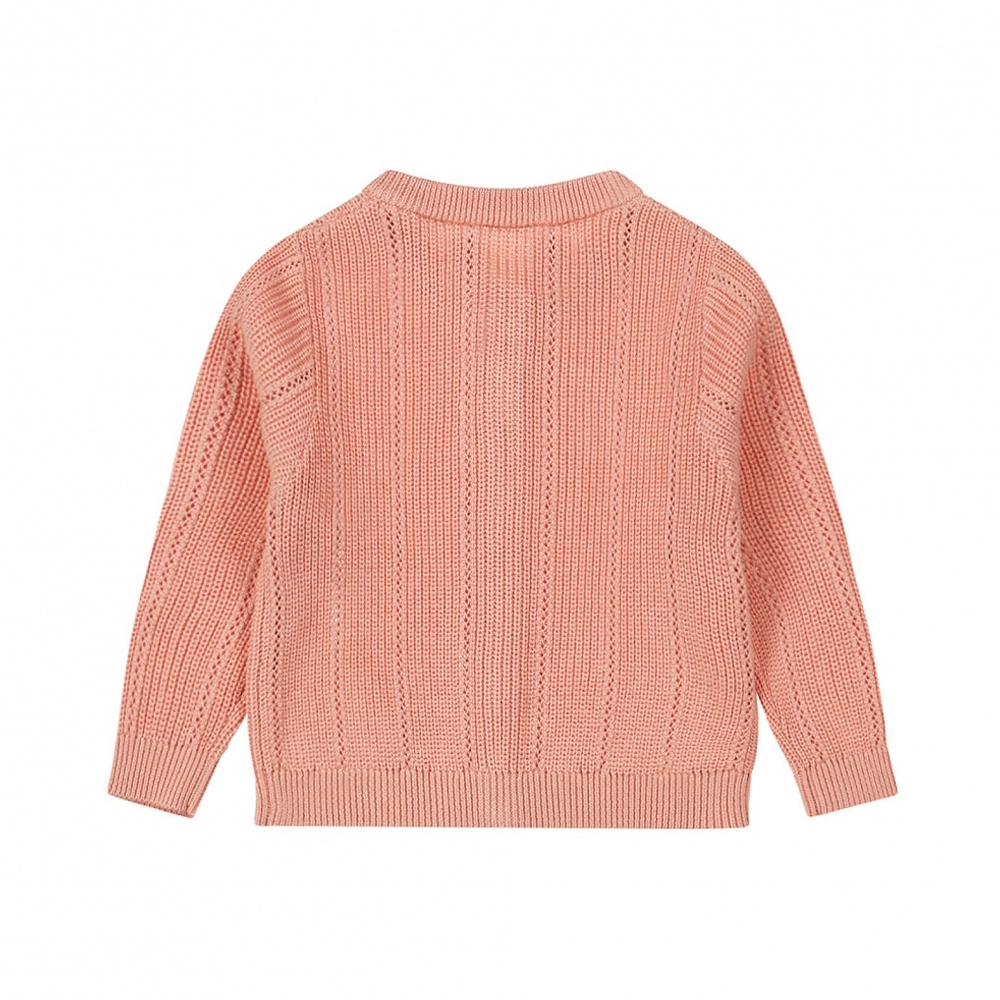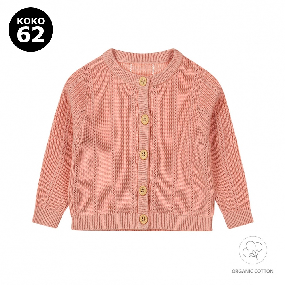 Tämä lasten yksivärinen neuletakki on helppo yhdistää asuun, kuin asuun. Dirkje lasten roosan värinen neuletakki on valmistettu pehmeästä 100% luomupuuvillasta.