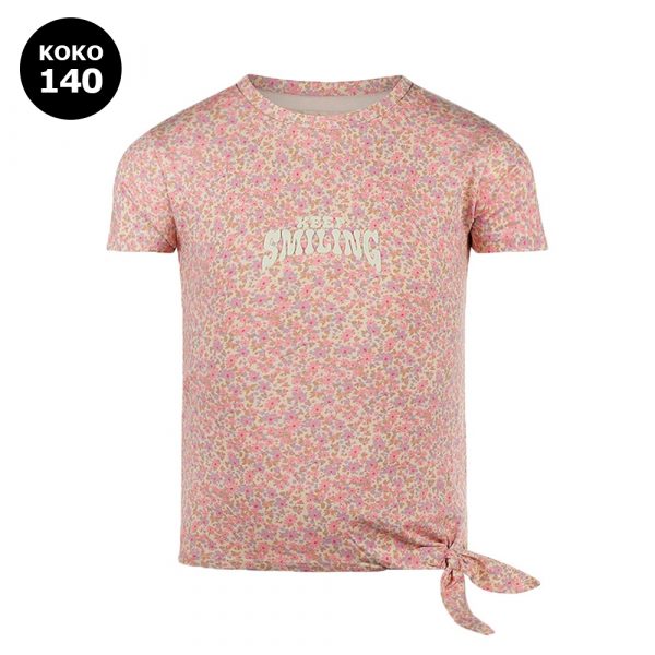 Koko Noko lasten t-paita solmu koristeella ja kukkakuviolla. Paidassa Keep smiling -teksti. Lyhythihaisen t-paidan materiaalit: 95% puuvilla ja 5% elastaani.