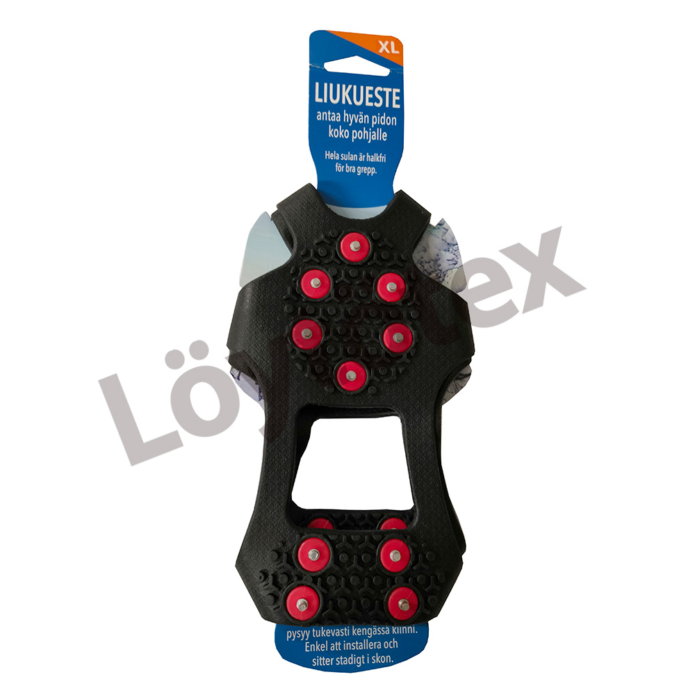 Hyvän pidon antava koko pohjan liukueste. Kestävät ja vaihdettavat kovametallinastat. Joustava ja kulutusta kestävä materiaali säilyttää ominaisuudet jopa -40C asti. Helppo asentaa ja pysyy tukevasti kengässä kiinni. Koko XL 43-46