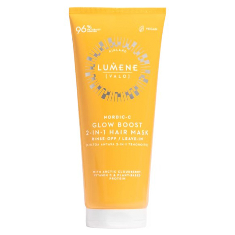 Lisää hiusten kiiltoa tyvestä latvoihin! LUMENE Nordic-C [Valo] Glow boost 2-in-1 hiusten tehohoito auttaa korjaamaan hiusten vaurioita ja jättää hiukset ravitun, pehmeän ja kevyen tuntuiseksi, sekä saa ne näyttämään kauniin kiiltäviltä. 96% luonnollista alkuperää oleva vegaaninen koostumus sisältää pohjoista lakkaa, C-vitamiinia ja kasvipohjaista proteiinia. Käytä poishuuhdeltavana, tai hiuksiin jätettävänä hoitotuotteena! Poishuuhdeltava hoitotuotteena: levitä pestyihin hiuksiin, anna vaikuttaa 5 minuuttia ja huuhtele huolellisesti. Hiuksiin jätettävänä hoitotuotteena: levitä pieni määrä kosteisiin hiuksiin auttamaan hiusten selvitystä, tai levitä pieni määrä kuiviin hiuksiin silottamaan pörröisyyttä stailatessasi hiuksiasi.
