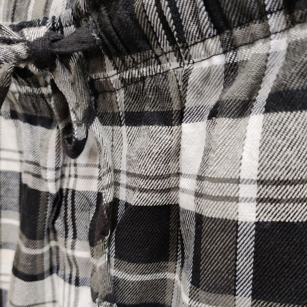 Musta-valko flanellihousut ruutu kuviolla. Vyötäröllä kiristysnyörit. Housuissa sivutaskut sekä yksi takatasku.