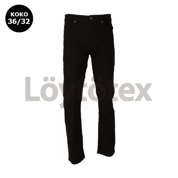 Tyylikkäät ja mukavat miesten stretch-twill housut arkeen ja vapaa-aikaan. Musta väri ja siisti leikkaus sopivat moneen tilanteeseen. Joustavat materiaalit tarjoavat hyvän käyttömukavuuden. Materiaalit: 98% puuvilla ja 2% lycra. Pesu 40 asteessa saman sävyisten kanssa. Ei rumpukuivausta.
