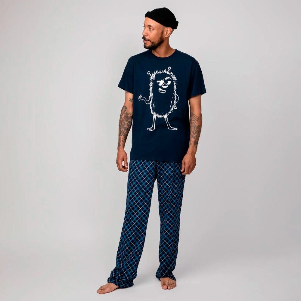 MOOMIN by Martinex Miesten Haisuli pyjama. Syvän tummansininen lyhythihainen pyjama, jonka pitkälahkeisissa housuissa on mukava kuminauhavyötärö. Pyjaman paidassa on veikeä kuva Haisulista ja housuissa ruutukuosi. Kuvan malli on 183 cm pitkä ja käyttää kokoa L. Materiaali 100% puuvillaa. Pesu 40 asteessa.
