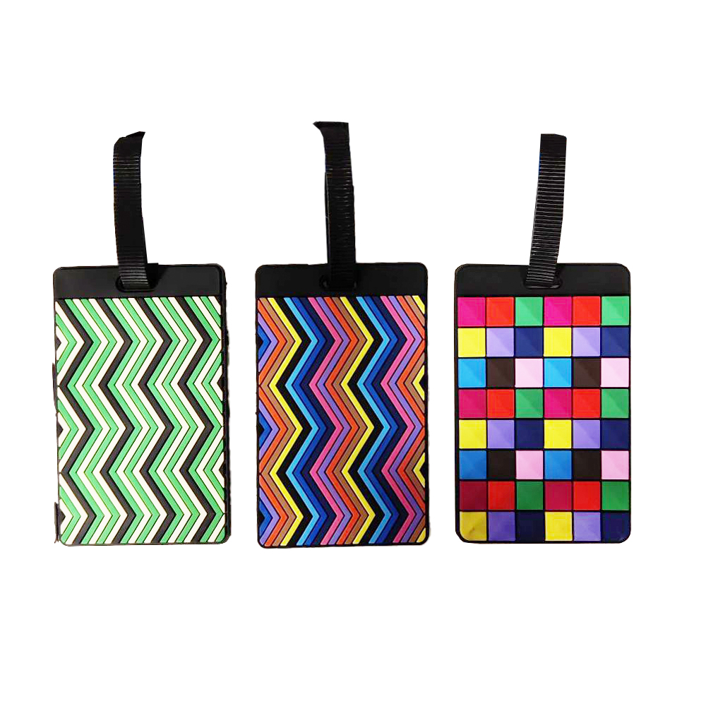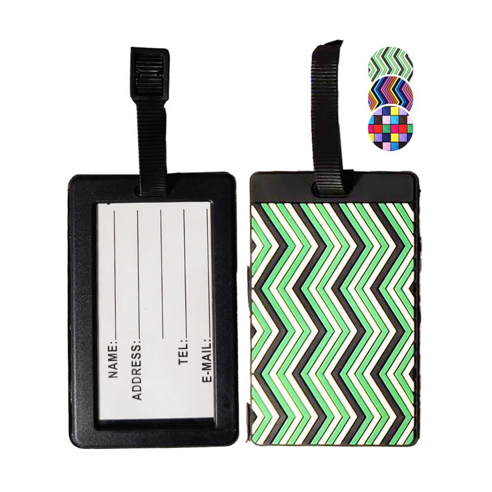 Monivärinen ja kuviollinen matkalaukun osoitelappu. Valitettavasti verkkokaupasta tilattaessa tuotteen väriä ei voi valita.
