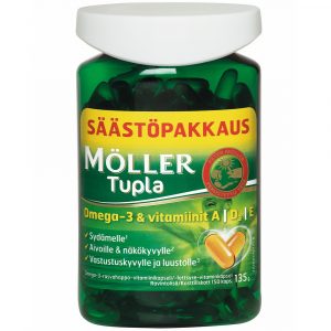 Möller kalanmaksaöljy sisältää terveyden kannalta välttämättömiä omega-3-rasvahappoja (EPA ja DHA) sekä A-, D3- ja E-vitamiineja. DHA edistää aivotoiminnan ja näön pysymistä normaalina. Edullinen vaikutus saavutetaan nauttimalla 250 mg DHA/vrk.DHA ja EPA edistävät sydämen normaalia toimintaa. Edullinen vaikutus saavutetaan nauttimalla 250 mg EPA+DHA/vrk. A- ja D-vitamiini edistävät immuunisysteemin normaalia toimintaa ja D-vitamiini myös luiden pysymistä normaaleina. E-vitamiini on antioksidantti, joka edistää solujen suojaamista hapettumisstressiltä.