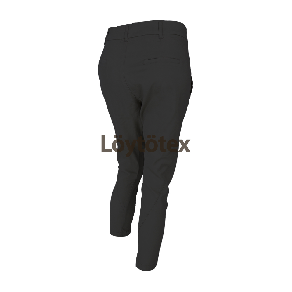 Naisten housut kapenevalla lahkeella. Housuissa sivusaumojen lisäksi jalkaa kiertävä koristeellinen sauma. Vyötäröllä vyönlenkit. Materiaalit: 64% puuvilla, 34% polyesteri ja 2% elastaani. Pesu 40 asteessa.