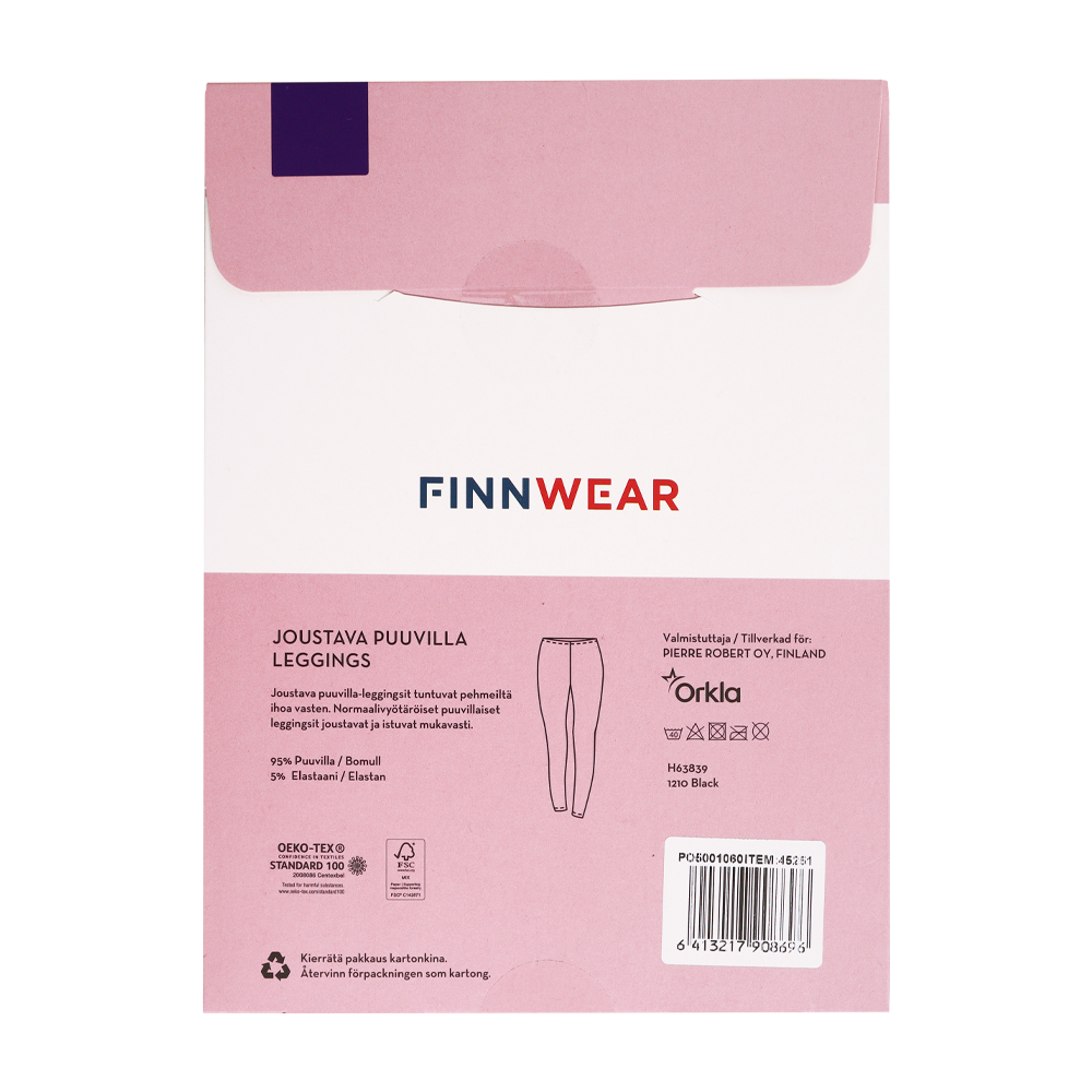 Finnwear Tiia -leggingsit tuntuvat pehmeiltä ihoa vasten. Puuvillaiset leggingsit joustavat, hengittävät ja istuvat mukavasti. Materiaali: 95% puuvilla ja 5% elastaani.