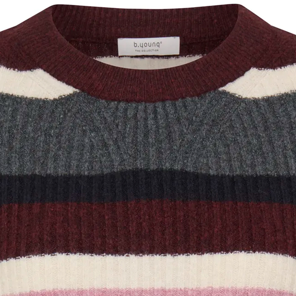 B.young – BYONEMA neulepusero raita sävyssä: viini. Normaali istuvuus. Materiaali: 62% polyesteri, 25% akryyli, 9% polyamidi, 4% elastaani.