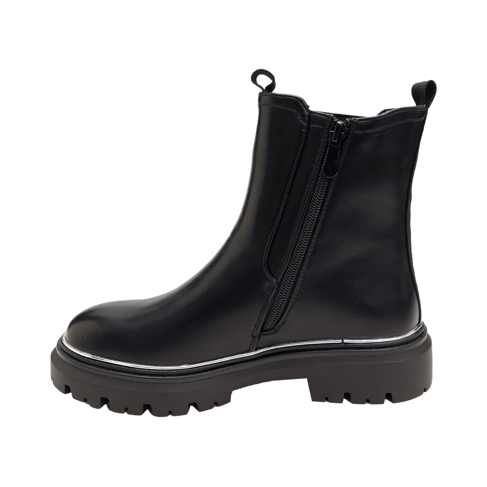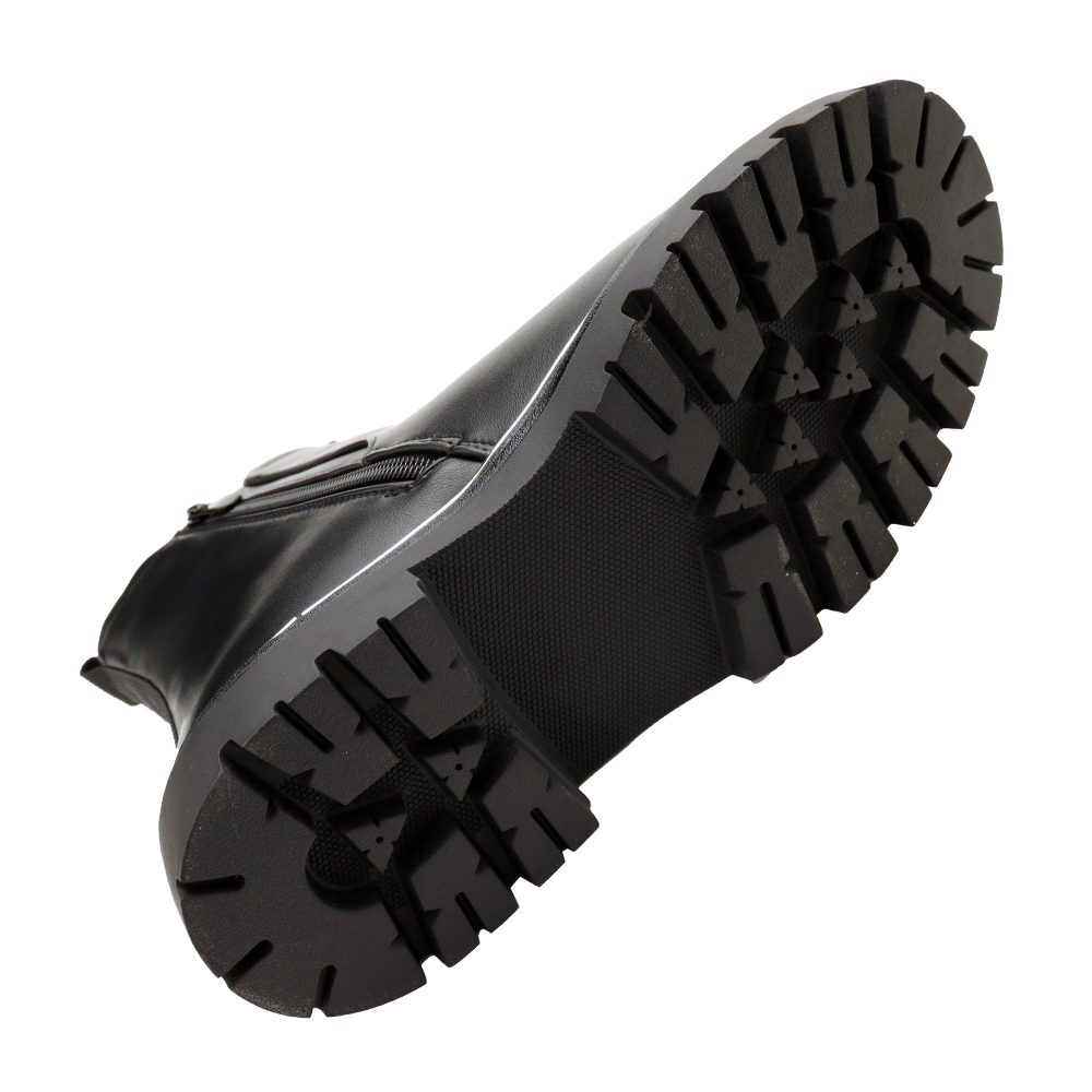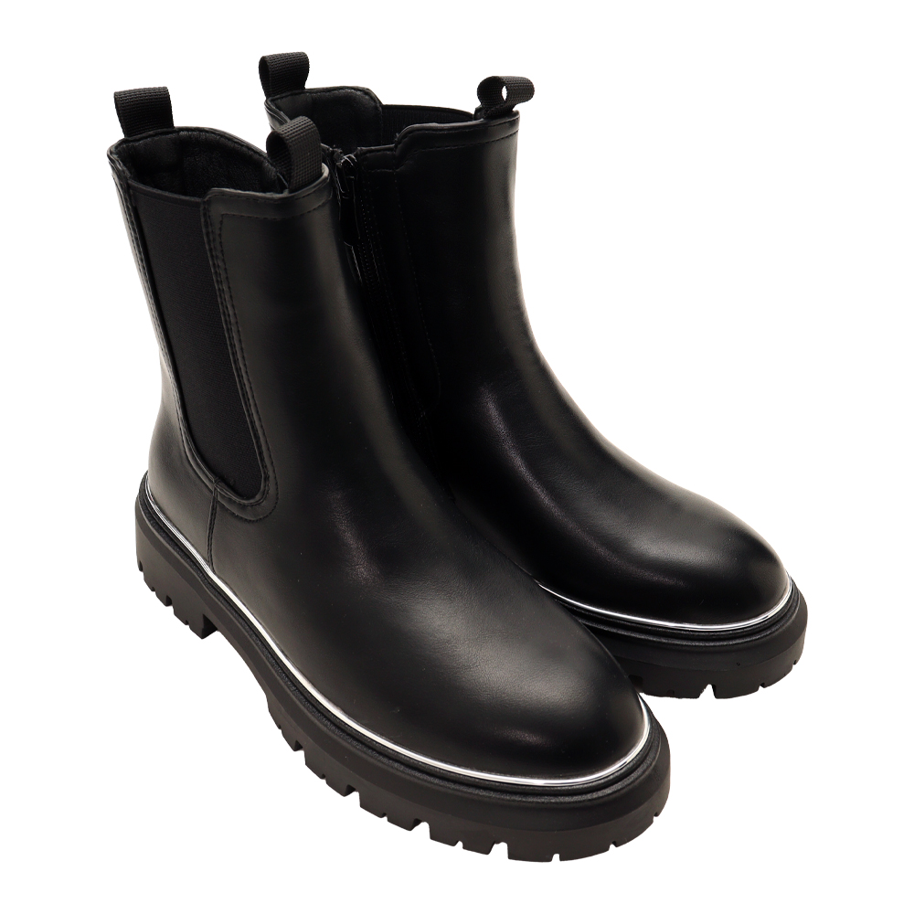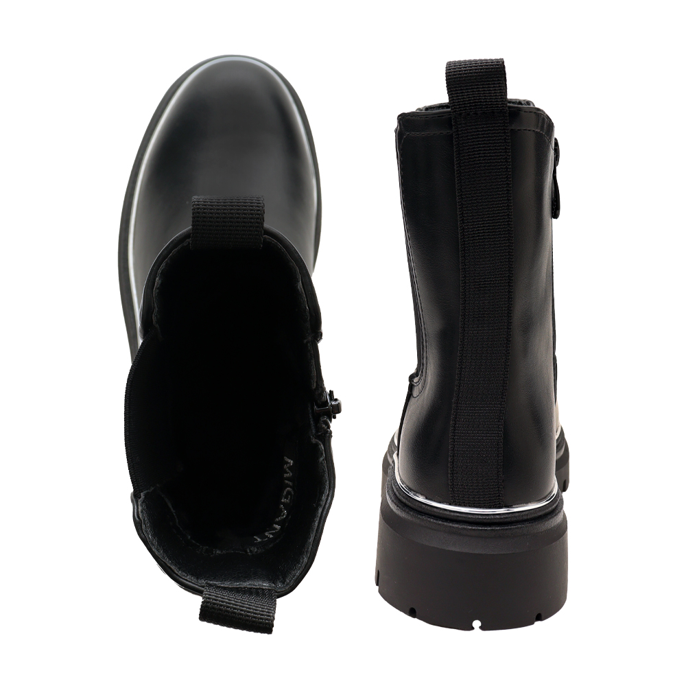 Migant mustat nilkkurit keinonahasta. Varressa jousto kiila ja vetoketju. Kengän pohjan yläpuolella hopea reunus / yksityiskohta.