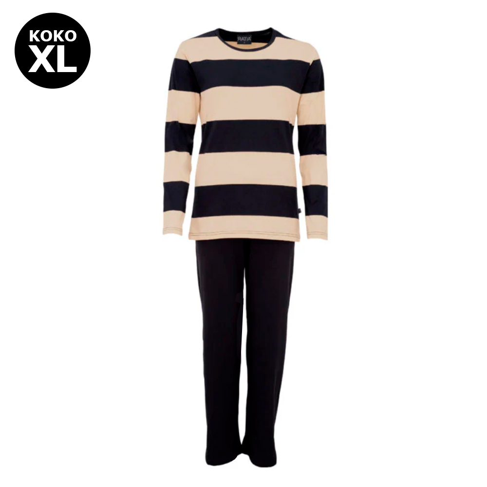 Naisten Ratia raidallinen pyjama värissä musta / hiekka. Paidassa 1/1 hihat ja housut ovat täyspitkät. Mitat vastaavat hyvin suomalaista standardimitoitusta. Materiaali 100% puuvillaa. Pesu 40 asteessa nurinpäin, muotoillaan kosteana.