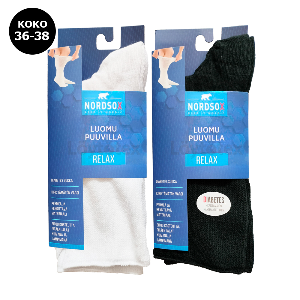 Nordsox mustat tai valkoiset diabetes sukat. Sukassa kiristämätön varsi. Sukka sitoo kosteutta pitäen jalat kuivana ja lämpimänä. Valmistettu pehmeästä ja hengittävästä luomu puuvillasta. Materiaalit: 80% puuvilla, 18% polyamidi ja 2% elastaani. Pesu 40 asteessa saman sävyisten kanssa. Mustat ja valkoiset sukat myydään erikseen. Valitettavasti verkkokaupasta tilattaessa tuotteen väriä ei voi valita.