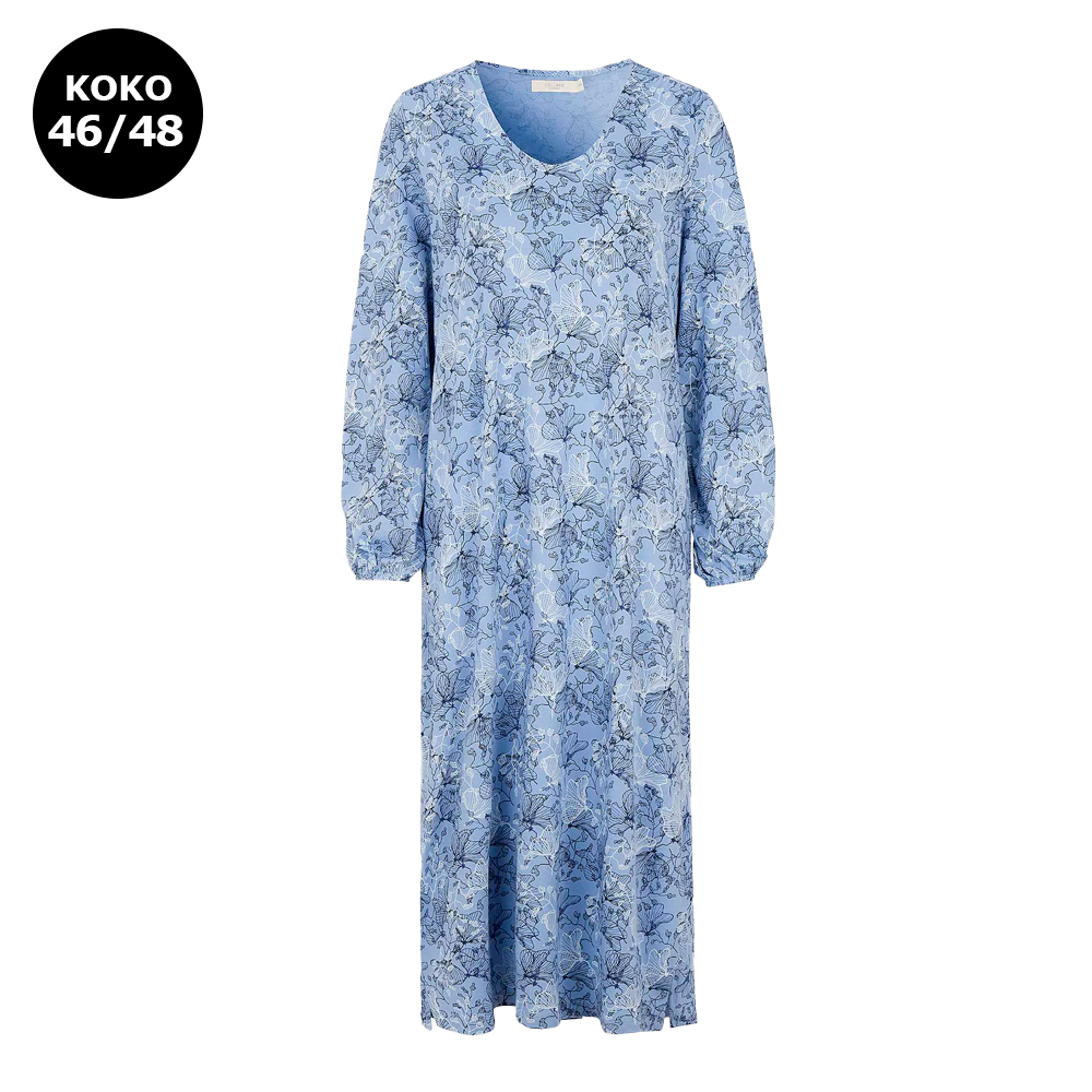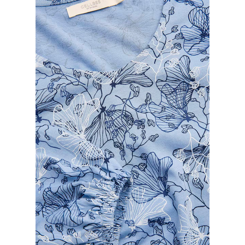 Cellbes pitkä yöpaita painetulla sini-valkoisella kukkakuviolla. A-linjainen malli pehmeästä puuvillajersey-kankaasta. Paidassa V-kaula-aukkoinen pääntie ja pitkät hihat resori hihansuilla. Paidan suorassa helmassa on halkiot sivuilla. Pituus olalta n. 120cm kaikissa kooissa. Materiaali: 100% ekologista puuvillaa. Pesu 40 asteessa.