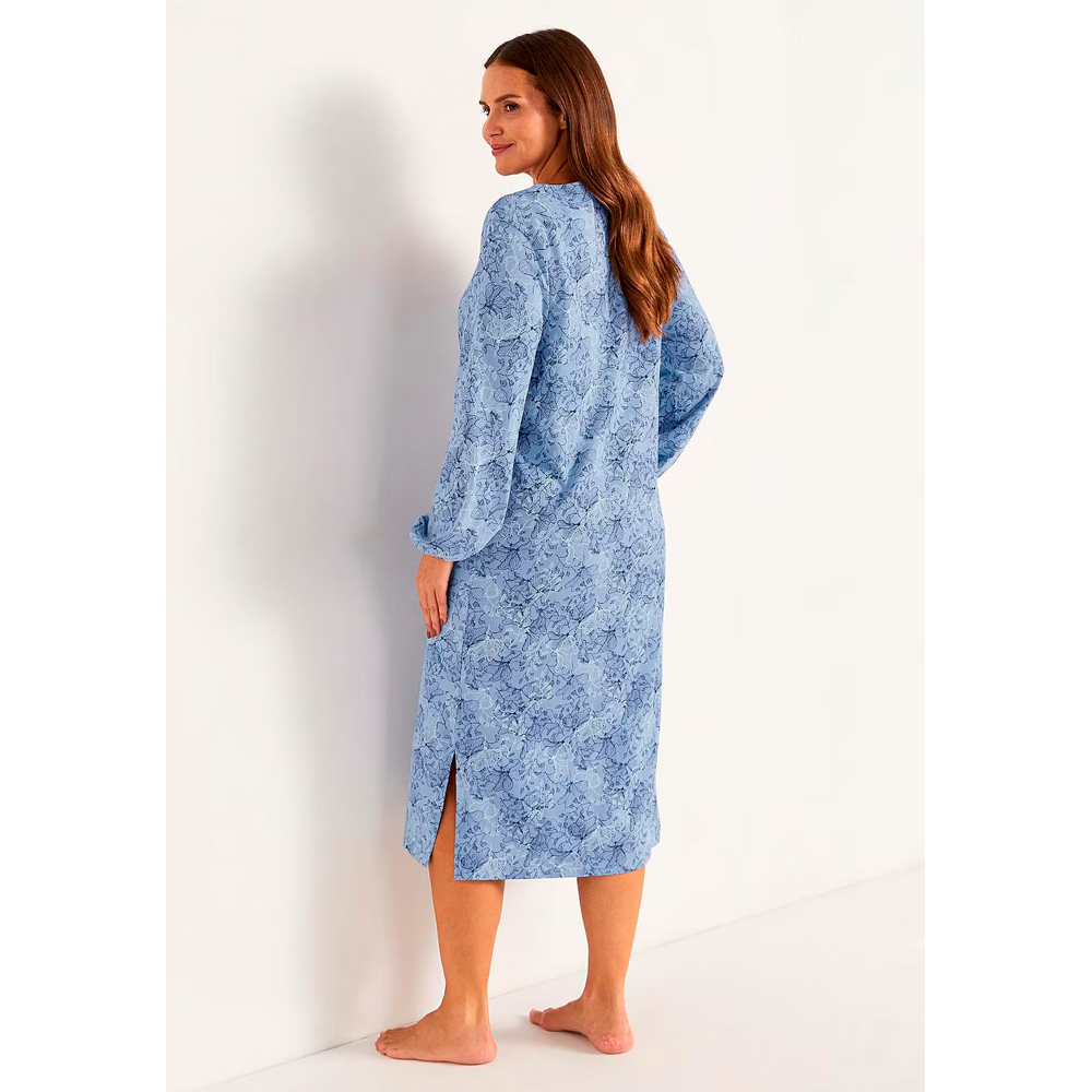 Cellbes pitkä yöpaita painetulla sini-valkoisella kukkakuviolla. A-linjainen malli pehmeästä puuvillajersey-kankaasta. Paidassa V-kaula-aukkoinen pääntie ja pitkät hihat resori hihansuilla. Paidan suorassa helmassa on halkiot sivuilla. Pituus olalta n. 120cm kaikissa kooissa. Materiaali: 100% ekologista puuvillaa. Pesu 40 asteessa.