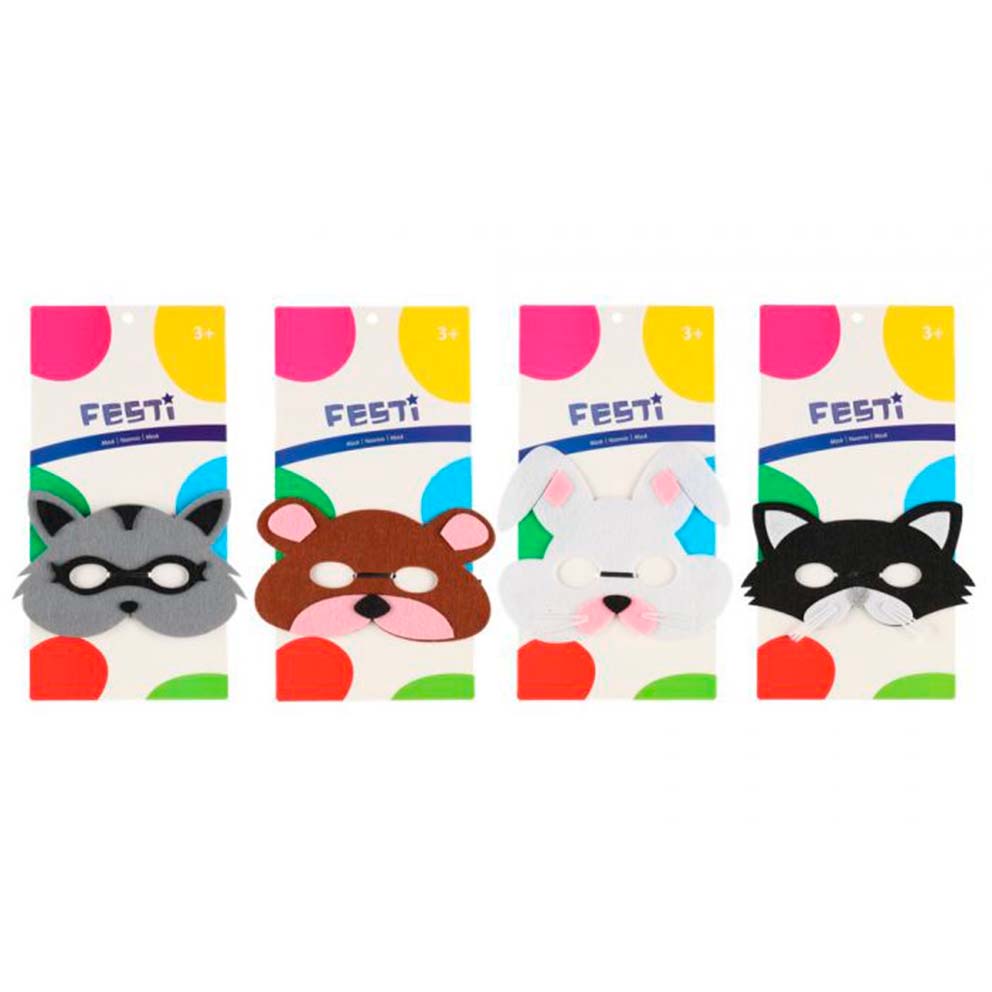 Lajitelmassa pupu, pesukarhu, karhu ja kissa -huopanaamiot.Verkkokaupasta ostettaessa aihetta ei voi valita.