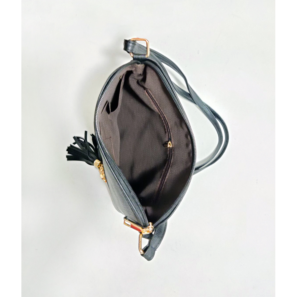 Musta olkalaukku kultaisilla yksityiskodilla ja hpasukoristeilla. Kaksi vetoketjullista taskua. Säädettävä olkahihna.