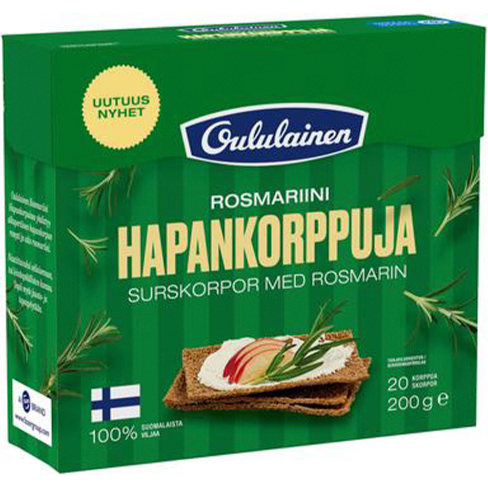 Oululainen Hapankorppu Rosmariini on maukas suomalainen hapankorppu, jonka maku tulee rukiista ja oikeasta rosmariinista. Hapankorppu rosmariini on erinomainen välipala, joka sopii arkeen ja juhlaan. Leivottu Suomessa taikinajuuresta ja 100% suomalaisesta täysjyvästä sekä on runsaskuituinen ja ilman lisäaineita.
