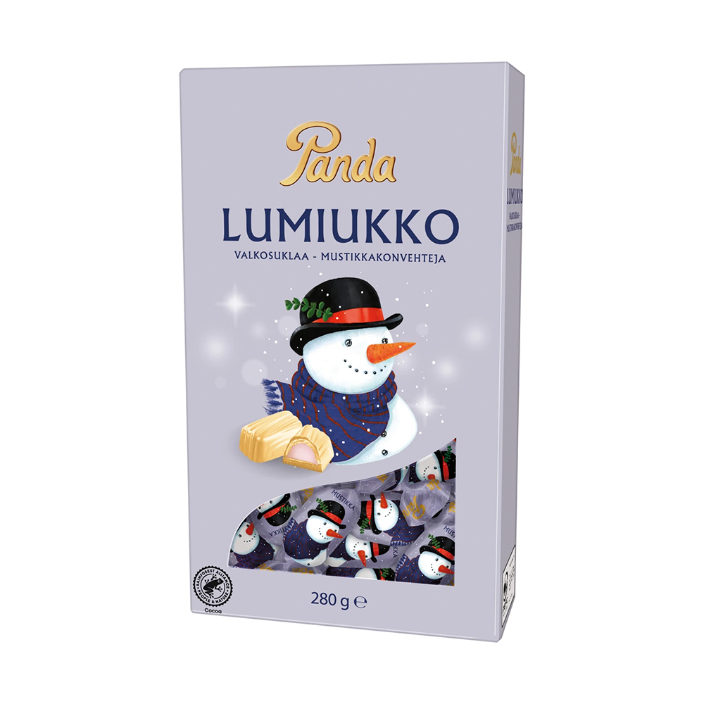 Panda Lumiukko valkosuklaakonvehdit pitävät sisällään herkullisen mustikka-maitotryffelitäytteen.