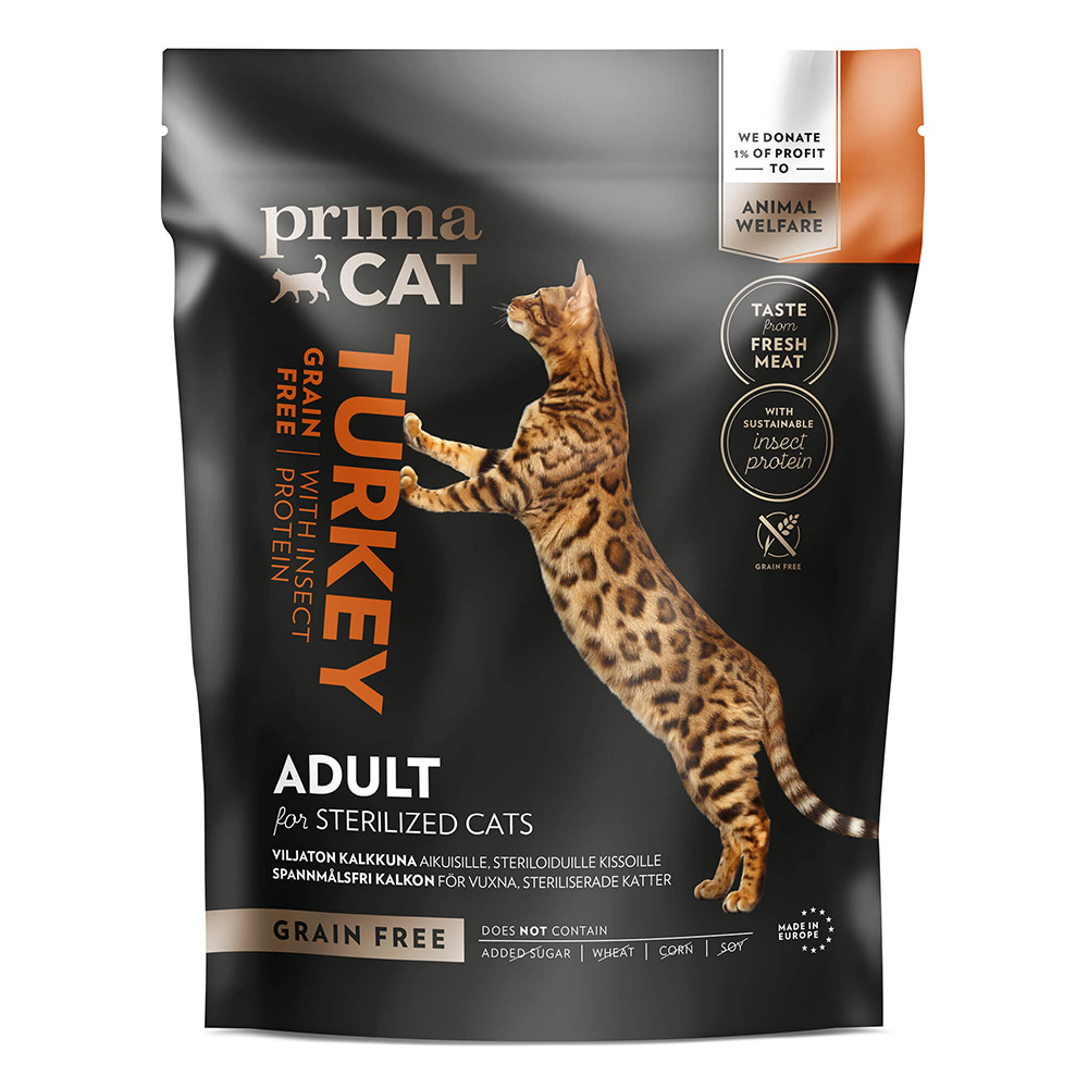 PrimaCat Viljaton Kalkkuna hyönteisproteiinilla aikuisille steriloiduille kissoille on suunniteltu sopimaan erityisesti steriloitujen, herkkävatsaisten kissojen ravinnoksi. Täysin viljattoman ja maissittoman reseptimme pääraaka-aineena on tuore kalkkuna, jolla on pyritty saamaan aikaan erinomainen maistuvuus.