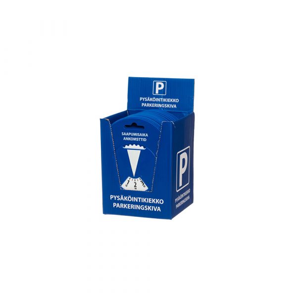 Monikäyttöinen sininen pysäköintikiekko, jossa mukana jääraappa, kuminen ikkunanpyyhin sekä tuulilasinpyyhkimen sulan puhdistusura.