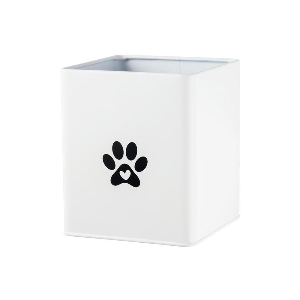 Metallinen säilytyslaatikko lemmikin ruoalle. Valkoisella pohjalla musta tassunkuva. Kannen kahvana on metallista muotoiltu tassu. Koko 14 x 14 x 19 cm. Vetoisuus 3 litraa.