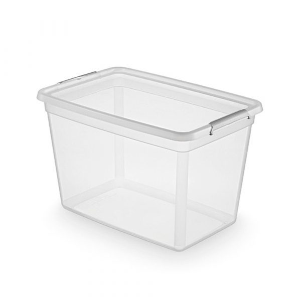 Tyylikkäät valkoiset lukot pitävät kannen tiukasti paikoillaan. Läpikuultavan laatikon sisältö on helposti nähtävillä ja pyöristetyt ulkokulmat estävät laatikkoa naarmuttamasta alustaansa.
