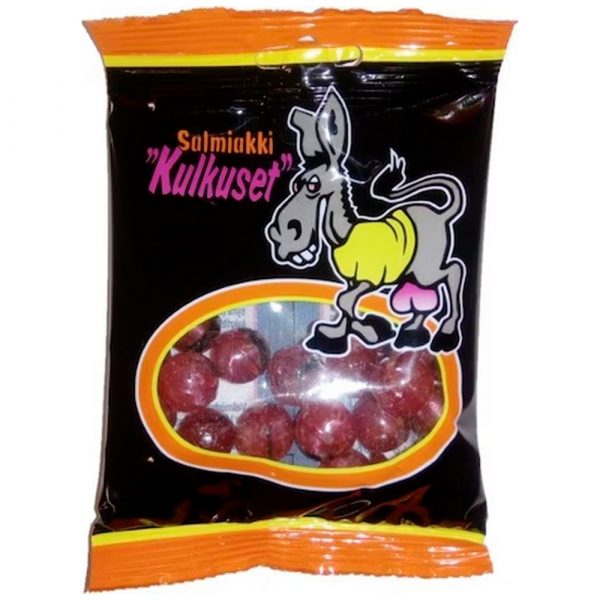 Pinnassa salmiakkijauhe, jonka sisällä vadelmainen kova karamelli.