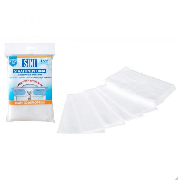 Kertakäyttöinen staattinen liina latautuu pyyhittäessä sähköisesti imaisten pölyn, karvat ja lian itseensä, eikä päästä niitä enää huoneilmaan. Reilunkokoinen liina sopii erinomaisesti myös käsinpyyhintään. Staattinen liina sopii pölyn poistoon kodin kaikilta pinnoilta: huonekaluista, valaisimista, TV-laitteista (sammuta TV), tietokoneista, seinistä, katoista ja lattialta. Käytä lattioille pölyn ja irtoroskan pyyhintään SINI-monitoimimopin ja pehmusteen kanssa.