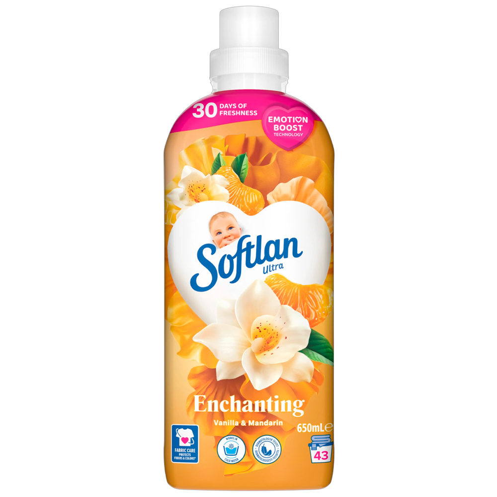 Softlan Perfumed Freshness Vanilla & Mandarin -huuhteluaine tekee pyykistäsi ihastuttavan pehmeää ja miellyttävän tuoksuista. Huuhteluaine jättää pyykkiisi pitkäkestoisen vaniljan ja mandariinin tuoksun. Huuhteluaine tekee pyykistäsi helpommin käsiteltävää verrattuna pesuun pelkällä pyykinpesuaineella. Soveltuu kaikille kankaille.