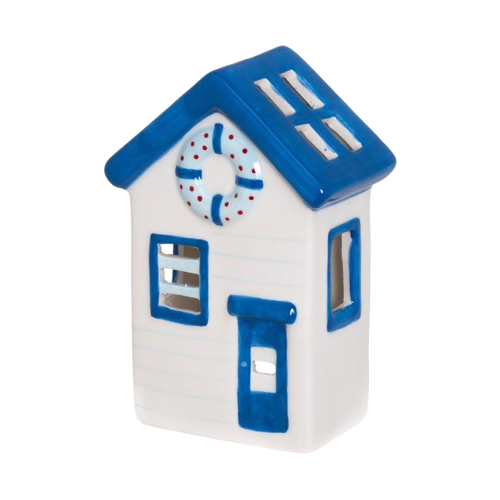 Viehättävä talonmuotoinen keraaminen lyhty. Suloinen rantamaja, jossa on sininen katto ja valkoiset seinät. Ikkunoista, katosta ja oven yksityiskohdista paistaa läpi pehmeä, kutsuva valo, joka luo kotoisan tunnelman. Hurmaavat keraamiset talonmuotoiset lyhdyt näyttävät kauniilta niin yksin kuin useamman kappaleen asetelmassa. Rakenna oma lyhtykyläsi ja ihaile ikkunoista loistavaa valoa. Soveltuu kynttilöille, LED-kynttilöille ja paristokäyttöisille koristevaloille. Lyhty soveltuu ympärivuotiseen käyttöön. Koko 10 x 6,5 x 15 cm.