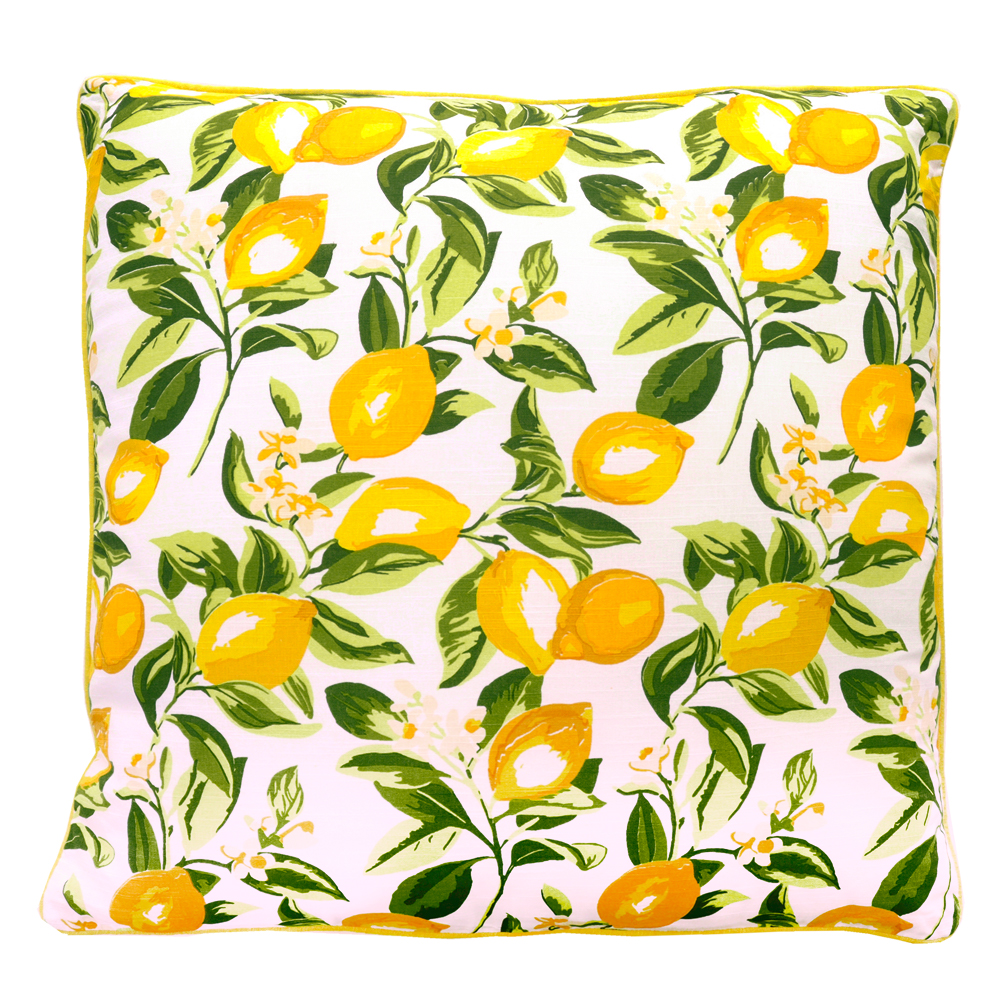 Kaunis sitruuna kuosillinen sisustustyyny. Toinen puoli tyynystä keltainen. Tyynyssä vetoketju ja irroitettava sisätyyny. Mitat: 50x50cm