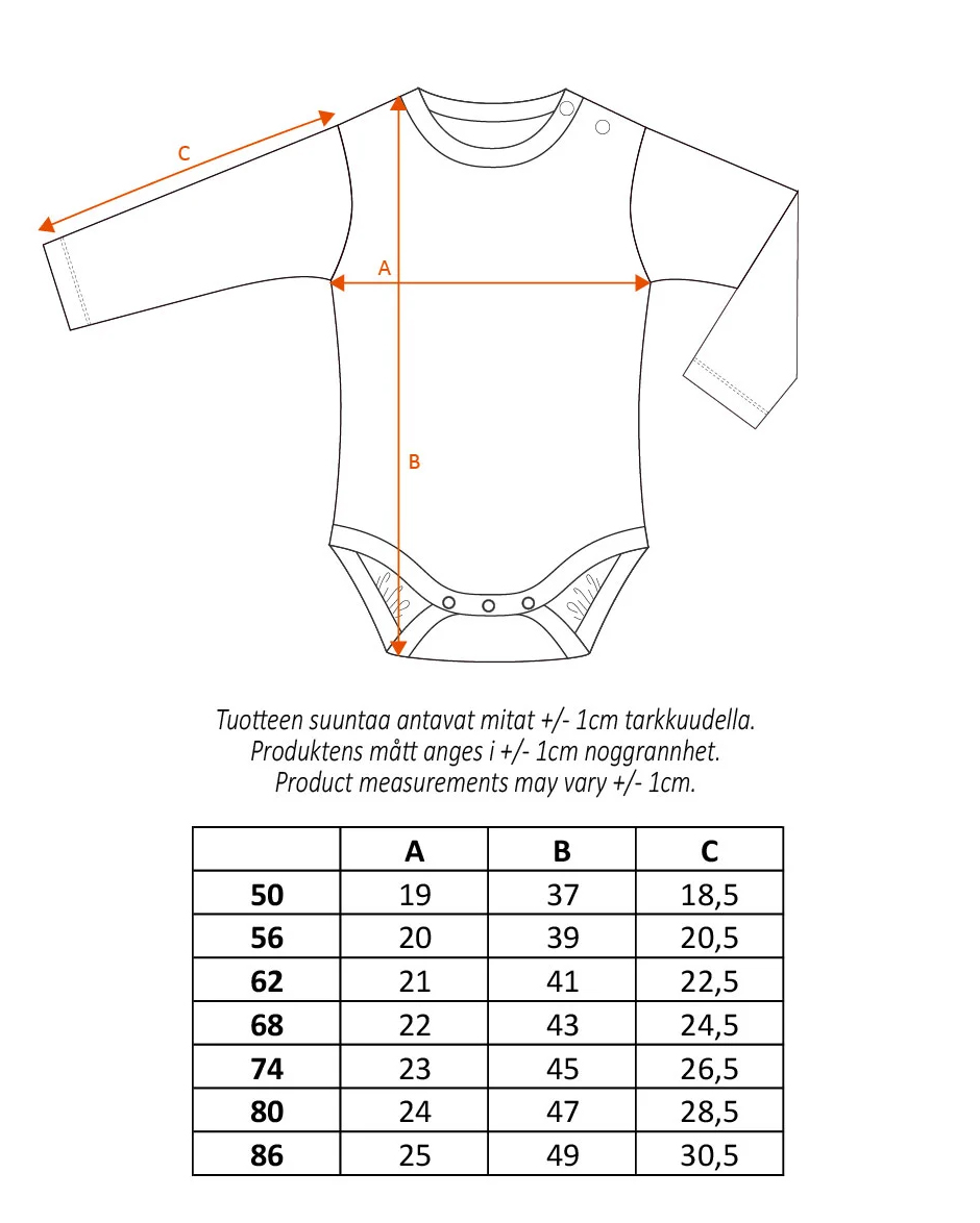 MOOMIN by Martinex – Vauvojen Muumi aiheinen, sininen body. Pitkähihaisessa bodyssa Yötaivas -printti, jossa esiintyy Muumipeikko ja Mörkö. Bodyssa nepparikiinnitys. Materiaalit: 95% puuvillaa ja 5% elastaania. Pesu 40 asteessa nurinpäin käännettynä.