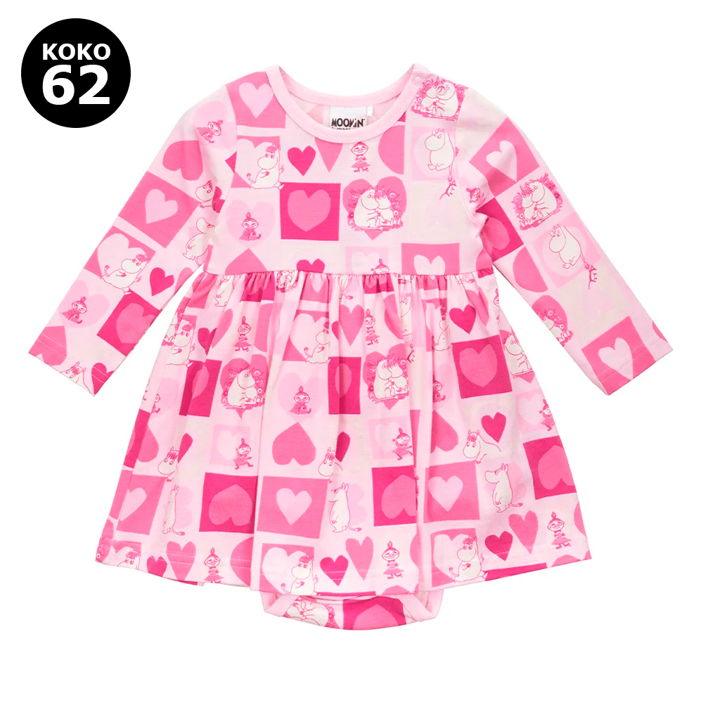 Kauniin vaaleanpunainen Ystävänpäivä-mallistoon kuuluva vauvojen pitkähihainen bodymekko, jonka runsaan helman alla on bodyn alaosa. Bodymekkoa on erityisen mukava käyttää, ja se pysyy hyvin yllä. Mekon vaaleanpunaisella pohjalla on ruutuja, suloisia sydämiä sekä kiintymyksestä viestiviä kuvia Muumipeikosta sekä Niiskuneidistä. Mekossa on pitkät hihat, A-linjainen runsas helma ja helman alla bodyn alaosa, jolloin mekko pysyy hyvin yllä. Olkapäällä valkoiset painonapit. Sivusaumassa valkoinen Moomin by martinex -merkki. Materiaali miellyttävän pehmeää ja ekologista luomupuuvillatrikoota. Valmistettu Öko-Tex-standardien mukaisesti.