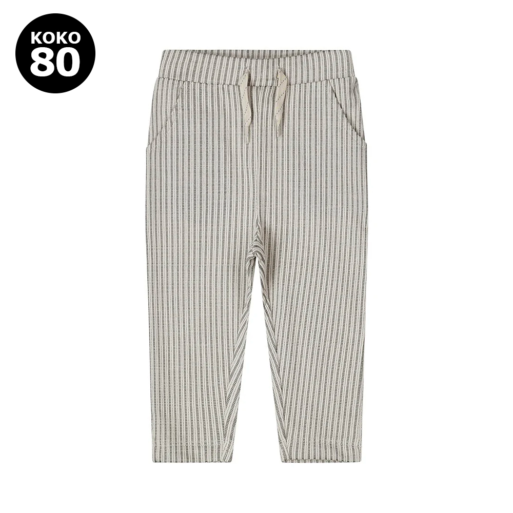 Dirkje lasten housut vihreillä raidoilla. Housuissa taskut ja vyötäröllä kiristettävät nyörit.