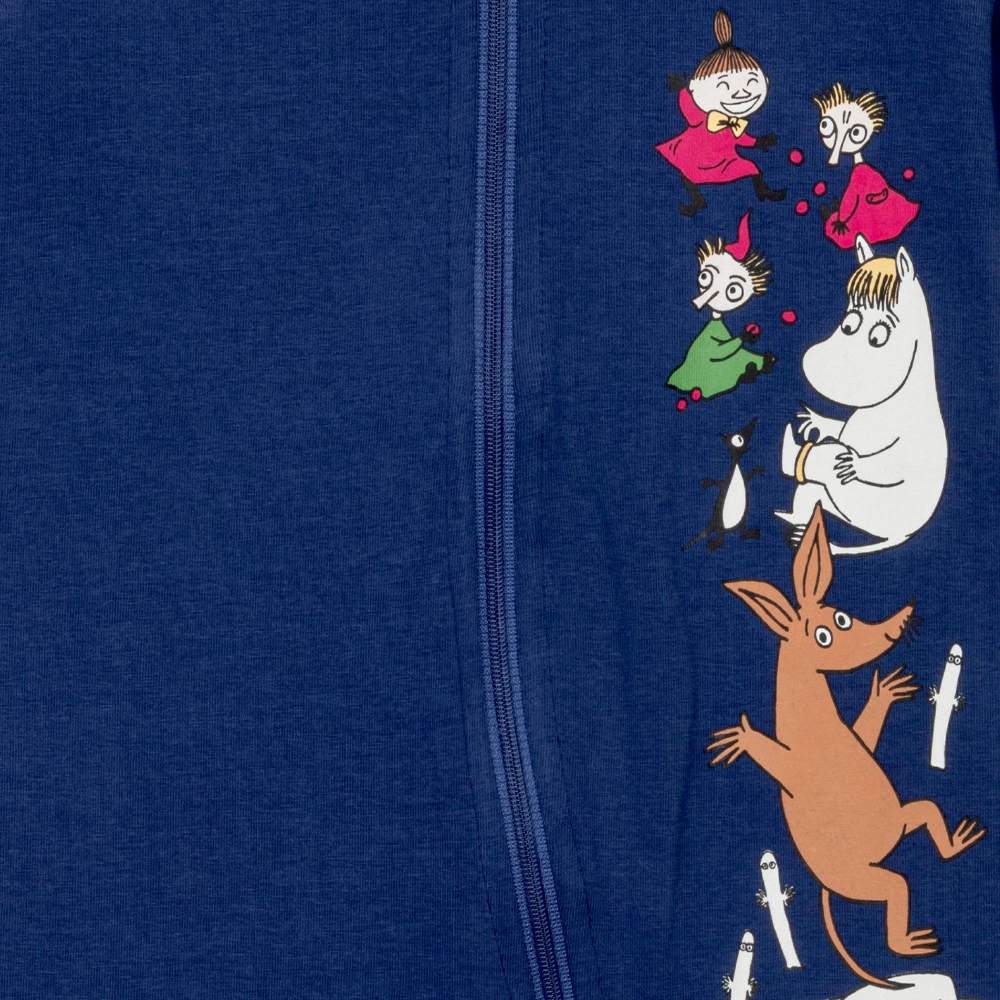 MOOMIN by Martinex – Vauvojen Muumi unihaalari Sekamelska -printillä. Sinisen värinen, pitkähihainen unihaalari, jossa on kaksisuuntainen vetoketju. Materiaalit: 95% puuvilla ja 5% elastaani. Pesu 40 asteessa nurinpäin käännettynä.