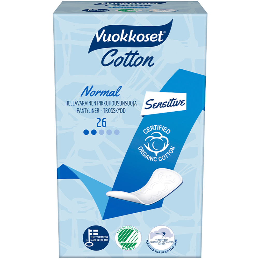Vuokkoset Normal on ihoystävällinen, hengittävä pikkuhousunsuoja. Sen pinta on aitoa 100% luomupuuvillaa ja sopii sen ansiosta erityisen hyvin myös erittäin herkälle iholle. Vuokkoset Cotton on ensimmäinen naisten hygieniatuotesarja, jolle on myönnetty Allergia- ja Astmaliiton tunnus. Vuokkoset pikkuhousunsuojat eivät sisällä lisättyjä hajusteita tai kemikaaleja.