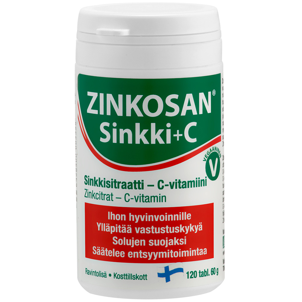 Zinkosan sisältää sinkkiä ja sen toimintaa tehostavaa C-vitamiinia, jotka edistävät immuunijärjestelmän normaalia toimintaa ja solujen suojaamista hapettumisstressiltä sekä ihon hyvinvointia.